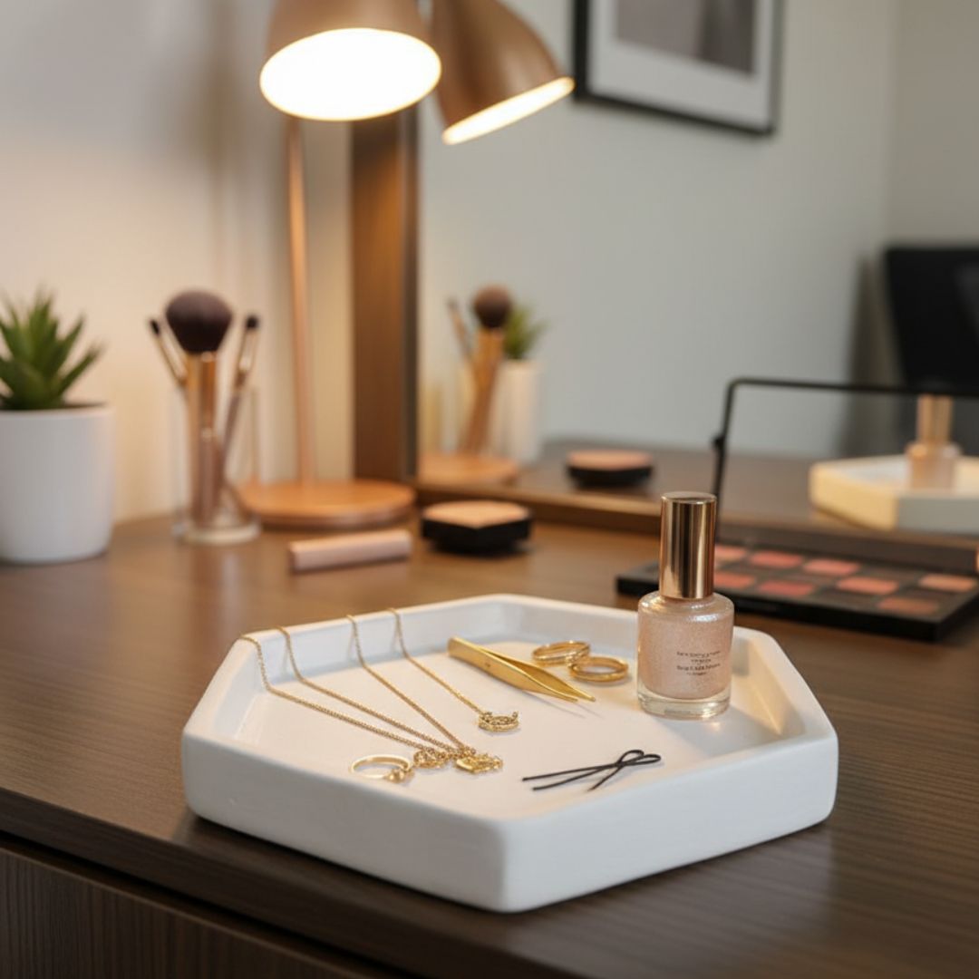 Añade un toque moderno y elegante a tu decoración con esta Bandeja decorativa Hexagonal. Su diseño geométrico y acabado suave la hacen perfecta para organizar velas, perfumes, joyas o pequeños objetos decorativos. Ideal para complementar cualquier espacio con estilo y sofisticación.