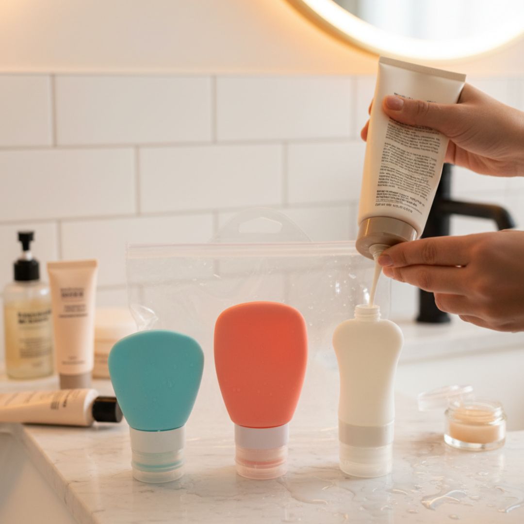 El Kit de envases viajeros en silicona te permiten llevar tus productos favoritos de forma segura, ligera y sin ocupar mucho espacio.