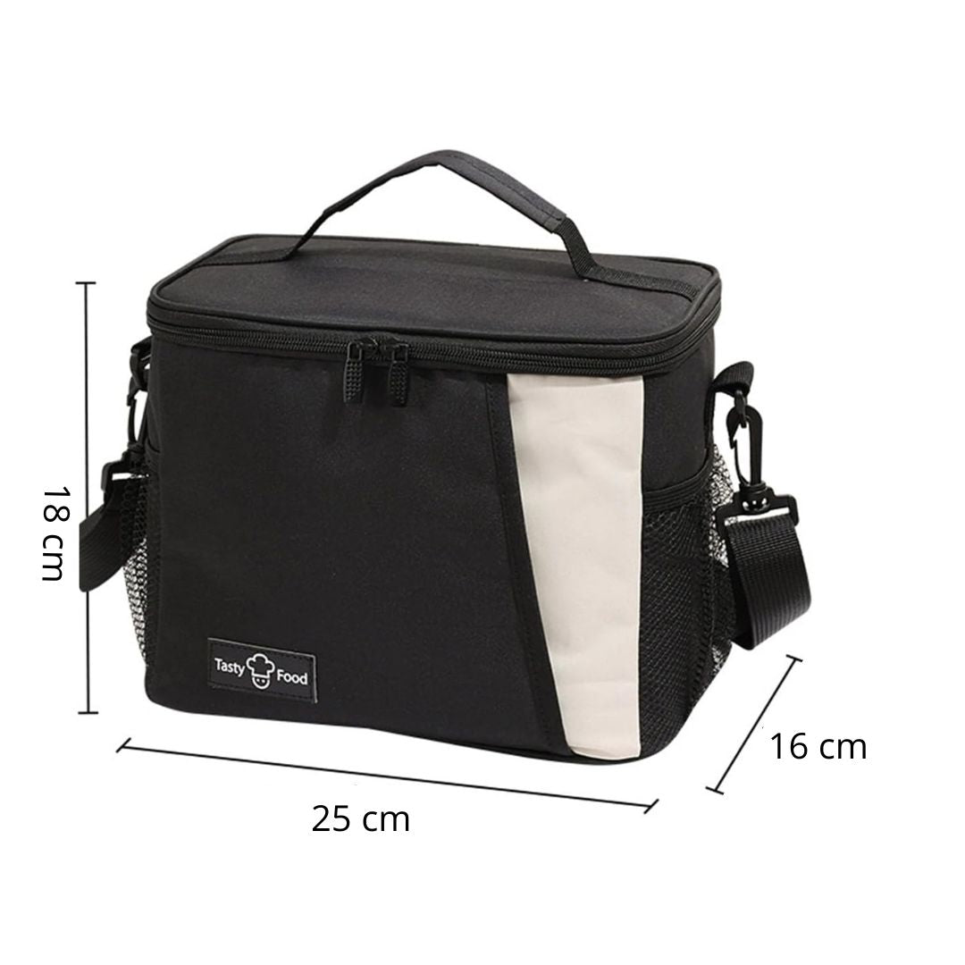 Olvídate de cargar con bolsas incómodas con nuestra Lonchera térmica permitiéndote llevar todas tus comidas de forma práctica cruzada o al hombro gracias a su diseño con correa ajustable. Su interior aislado mantiene tus alimentos frescos o calientes por horas siendo ideal para el trabajo, la universidad o un día de paseo. Está fabricada con materiales resistentes y fáciles de limpiar, además, incluye bolsillos adicionales para cubiertos, snacks y tu botella de agua.