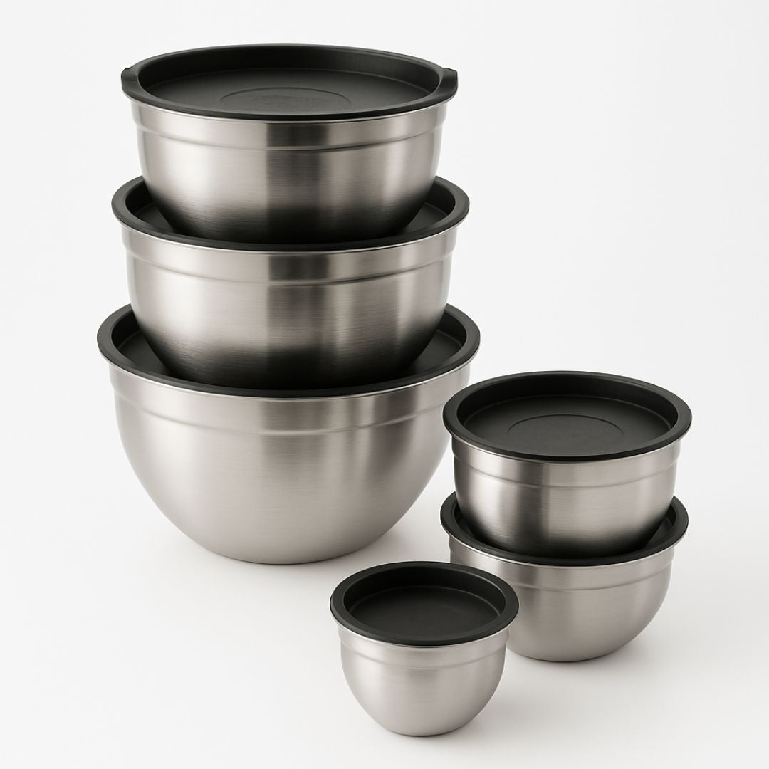 Nuestro Set de bowls x6 con tapa fabricados en acero inoxidable, son perfectos para mezclar ingredientes, almacenar alimentos o llevar tus preparaciones a cualquier lugar sin preocuparte por derrames o contaminación, también puedes guardar sobras en la nevera porque gracias a sus tapas todo se mantiene fresco por más tiempo. Además, se apilan entre sí para ahorrar espacio cuando no los estés usando.