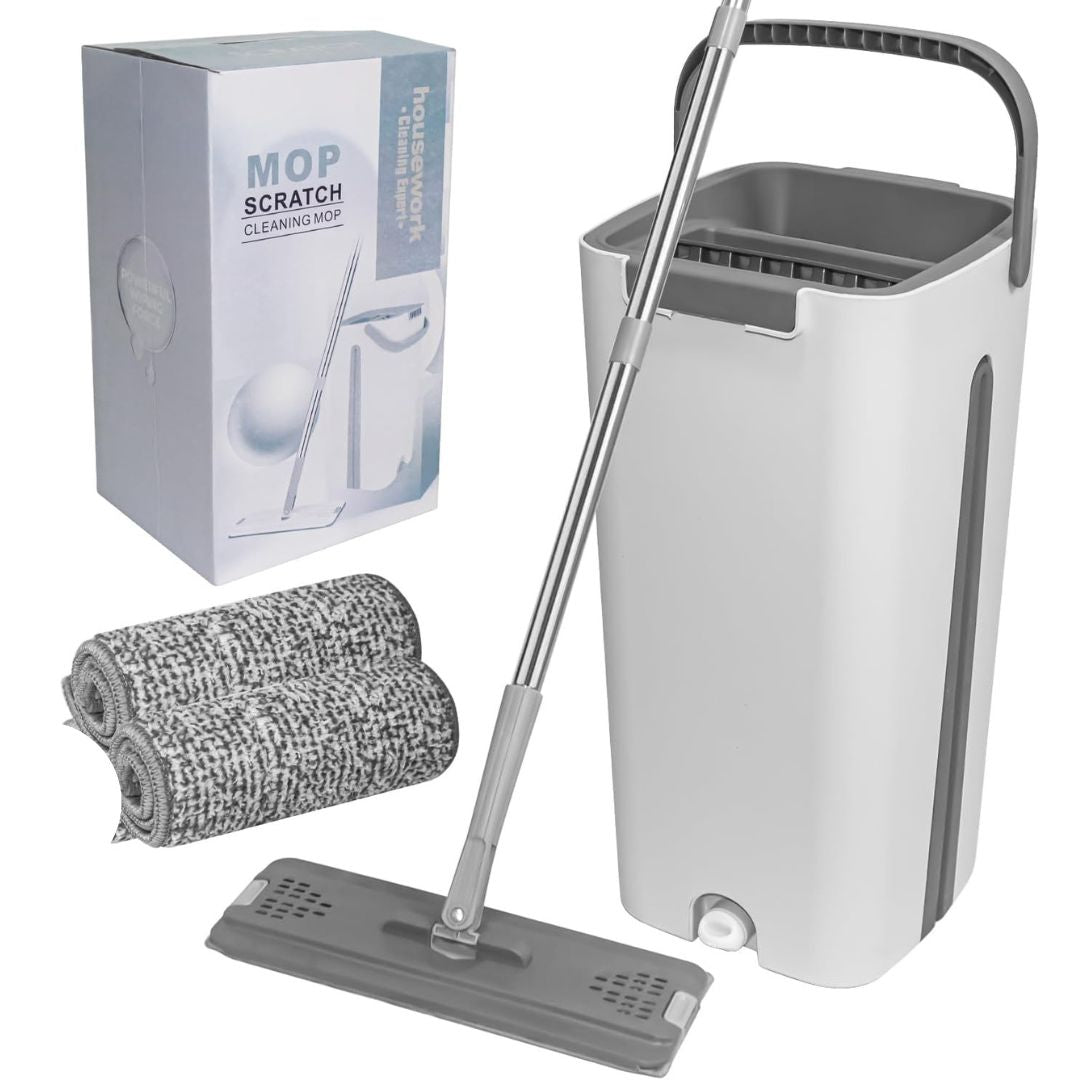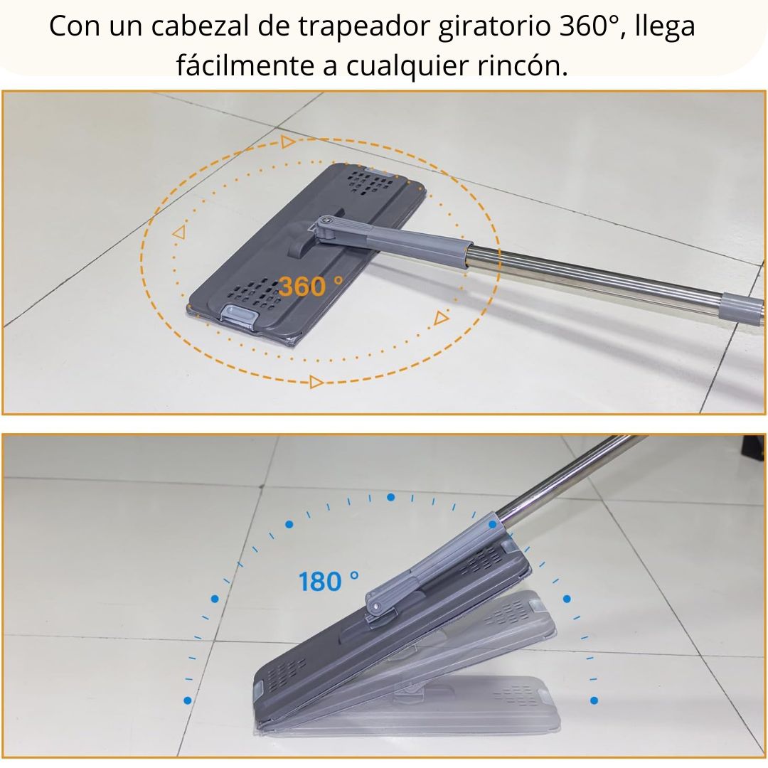 Con el Trapero plano con balde escurridor podrás hacer la limpieza más rápida, sencilla y sin incomodidad al escurrir. Tiene un diseño innovador que permite eliminar polvo y trapear, todo con una sola herramienta, ahorrando también espacio en la casa. Además, tiene su propio sistema de escurrido, eliminando así la necesidad de agacharse o entrar en contacto con el agua sucia.